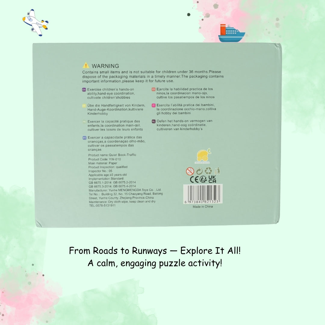Introduce your little one to the exciting world of vehicles with this Vehicles Theme Quiet Book, specially designed for toddlers aged 18 months and above. This interactive velcro-based learning book combines creativity and education, offering a hands-on experience that keeps children engaged, curious, and happily learning through play.